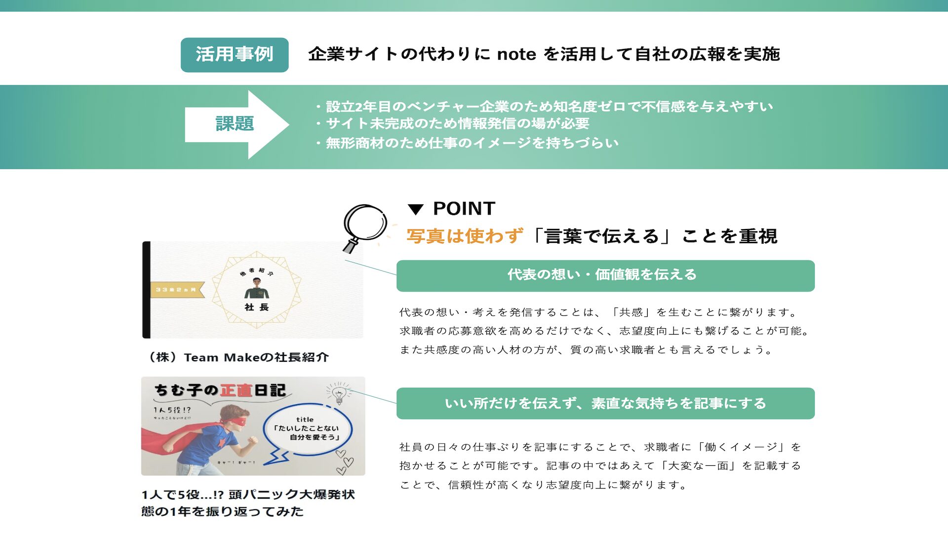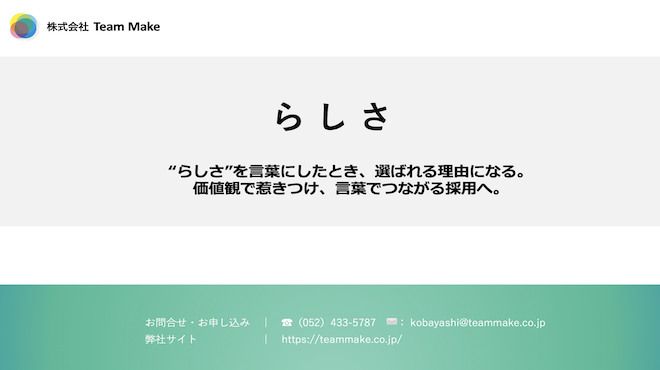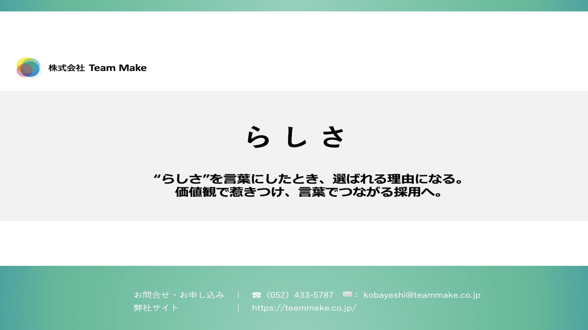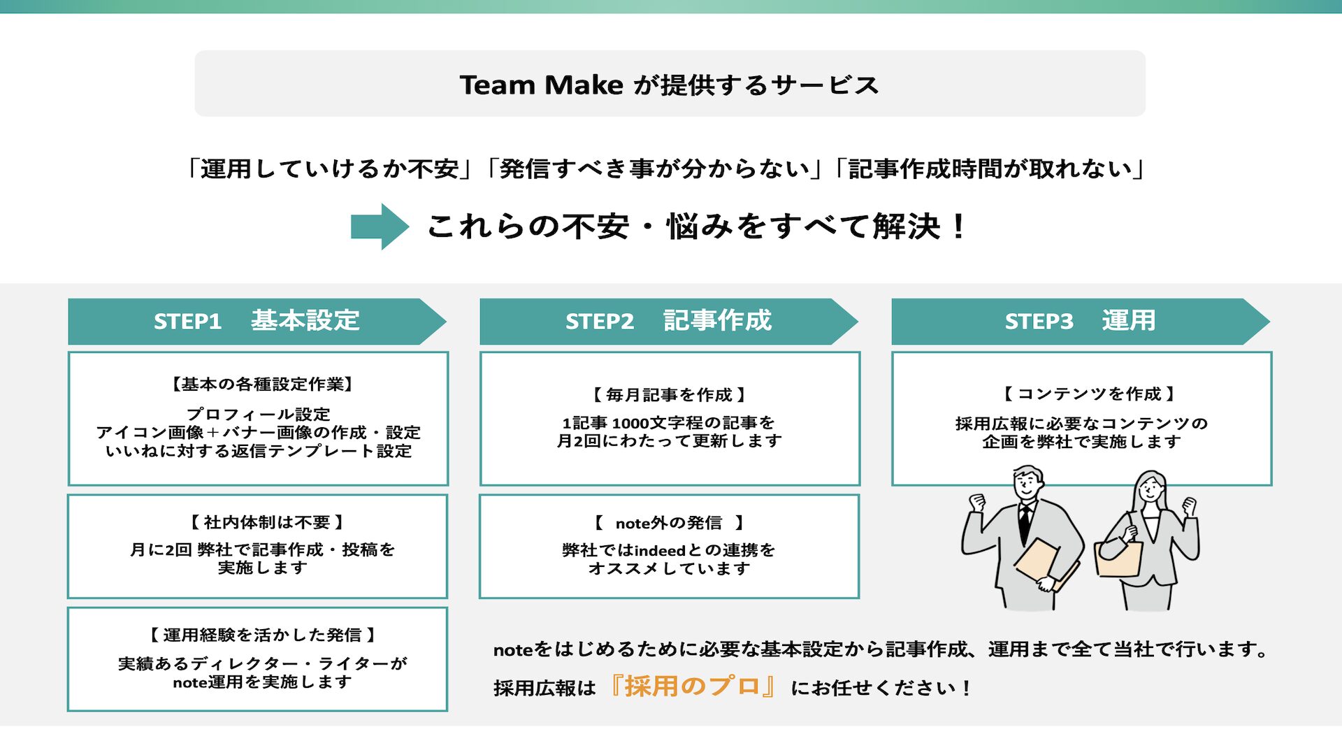 採用は「人を集めること」ではなく「自分たちを信じられる組織」をつくること。 株式会社Team Makeは、採用から組織づくりまでを一気通貫で支援する、クライアントの成長パートナーです。 私たちが向き合うのは、表面的な求人のテクニックではなく、企業の内側にある「らしさ」や「想い」。それを丁寧に言葉へと編集し、本当に必要な人材の心に届く形で発信します。 採用戦略の設計から育成・マネジメントまで、プロセスを伴走しながら事業と人の可能性を最大限に引き出す。それがTeam Makeの役割です。