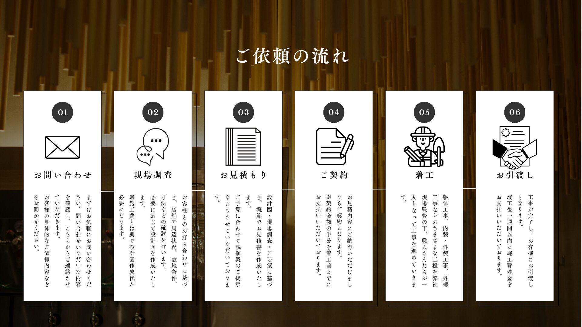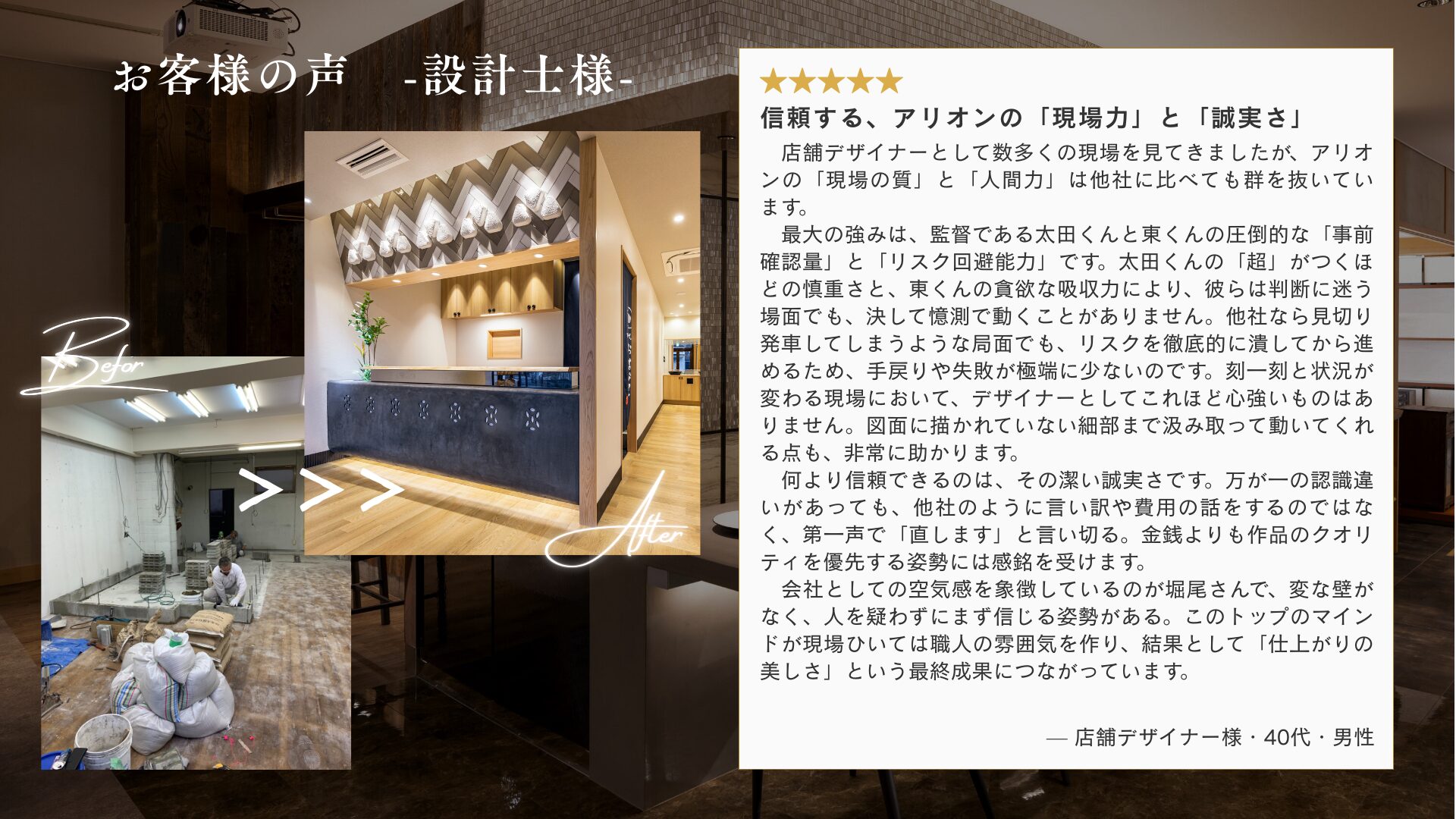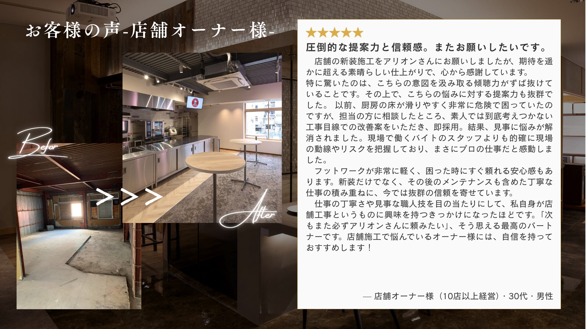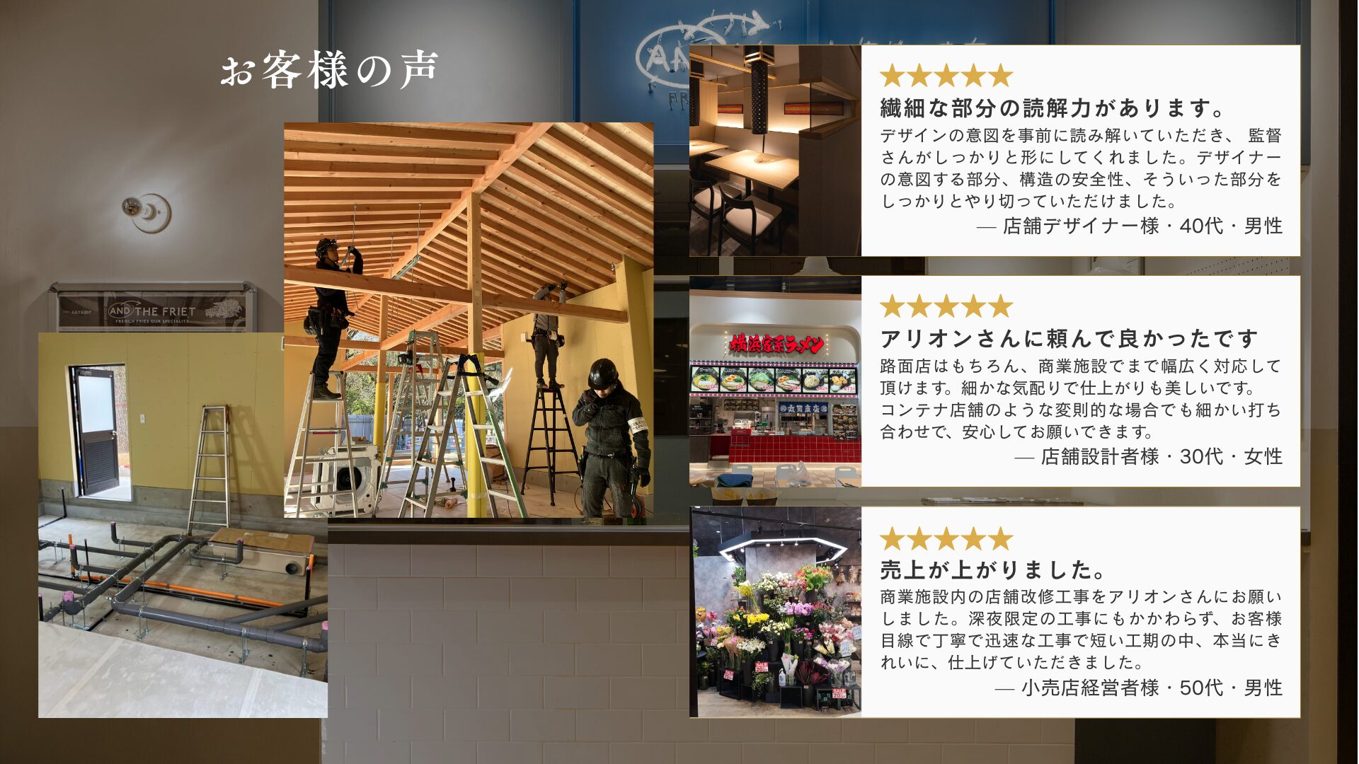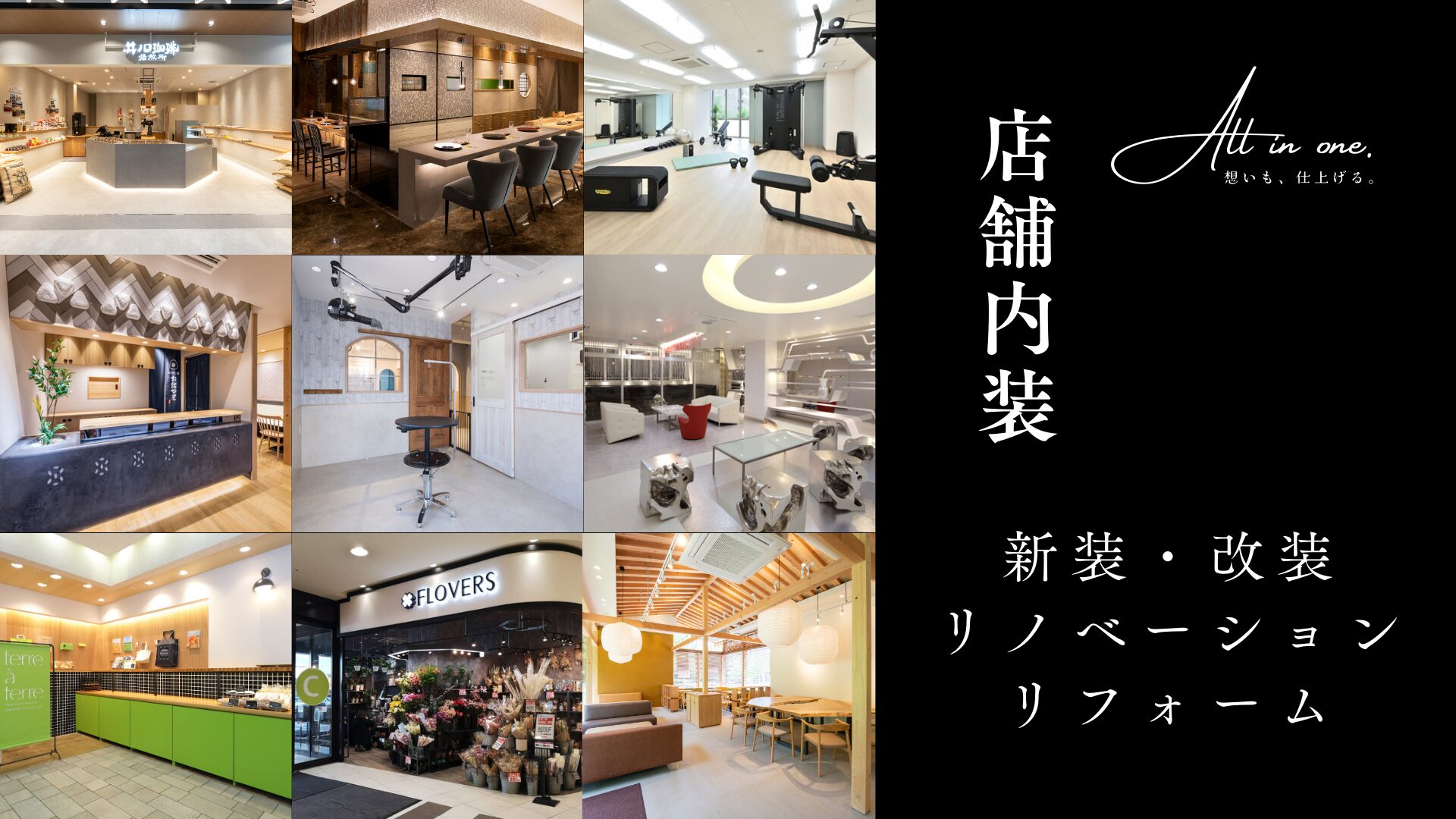 株式会社アリオンは、名古屋市を中心として店舗の設計・施工を行なっています。 オーナー様の夢や覚悟を、職人たちの技で仕上げる。 その全部をひとつに束ねるために生まれた言葉が“ALL IN ONE”。 空間をつくるだけでなく、図面の向こうの想いまで読み取り、想いも、仕上げる。 アリオンは、お店の『はじまり』をつくる工務店です。 内装で変わりたいとお考えのオーナー様、お気軽にお問い合わせください。