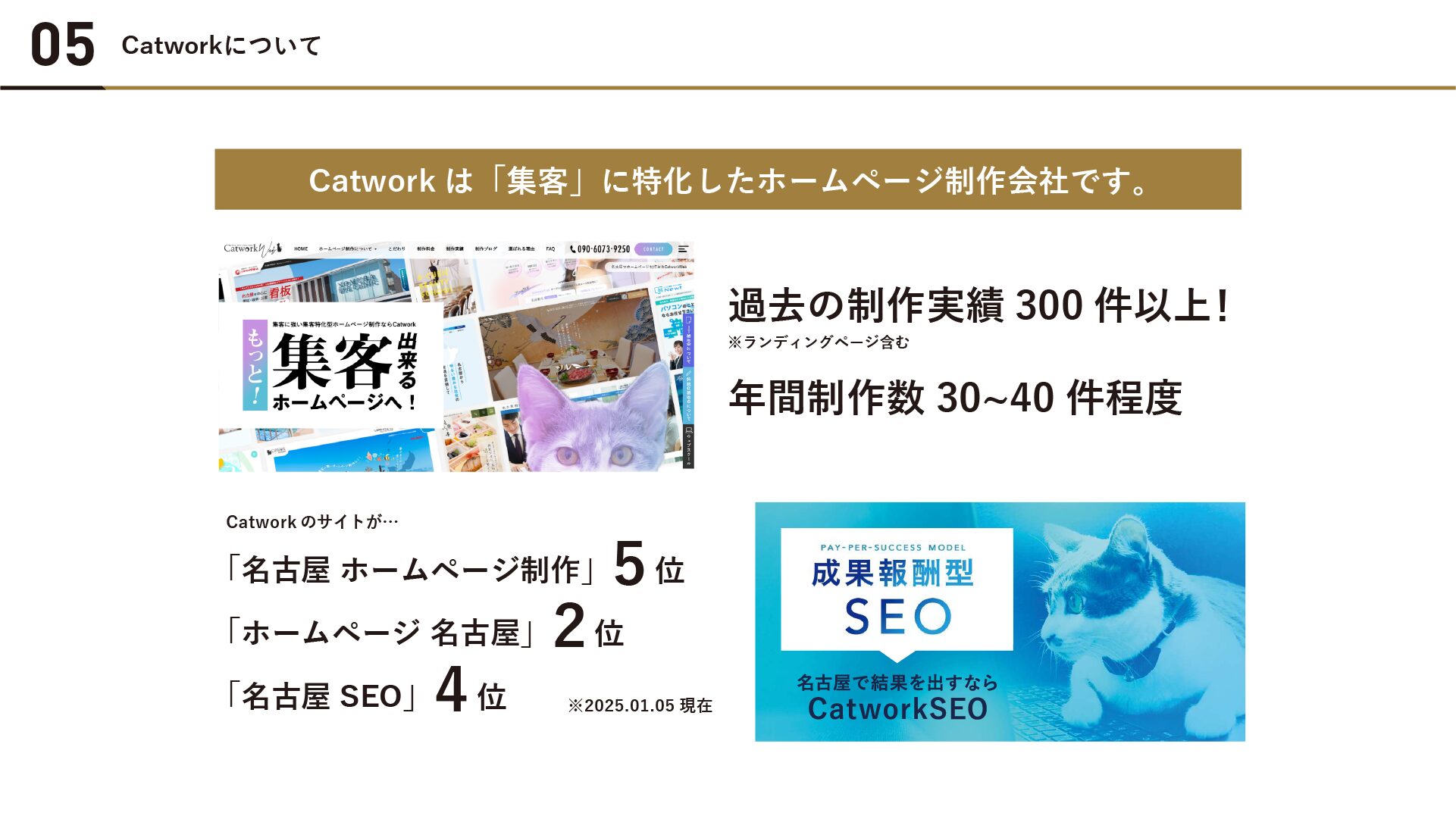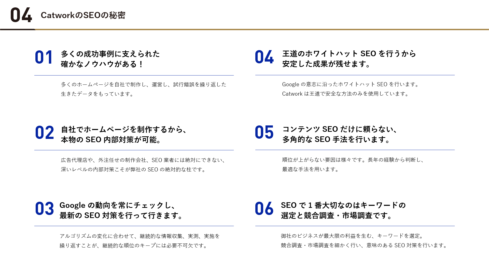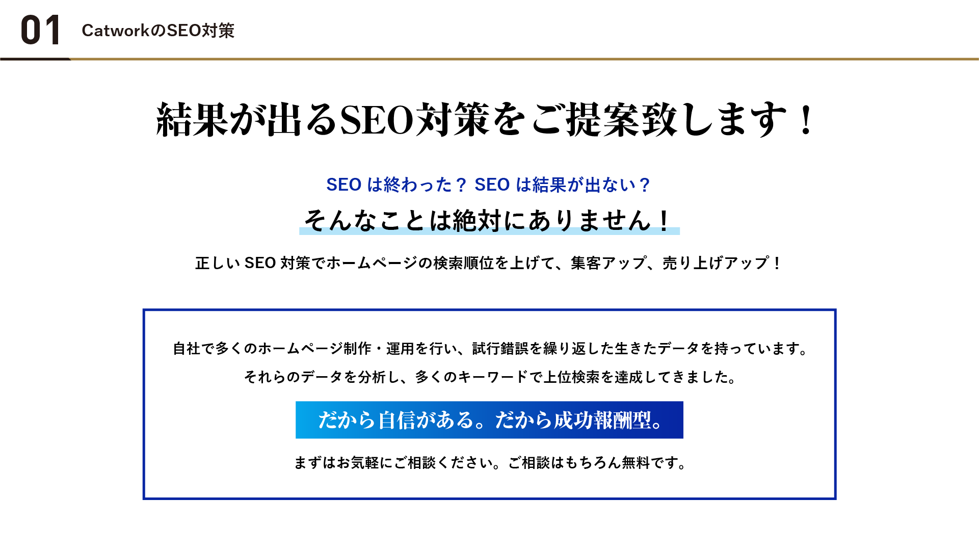 成果に強いSEO対策で集客をサポート!名古屋発のCatworkSEOは、キーワード戦略と内部対策で検索順位アップを実現。成果報酬型でコストを抑えた安心のSEOサービスです!
