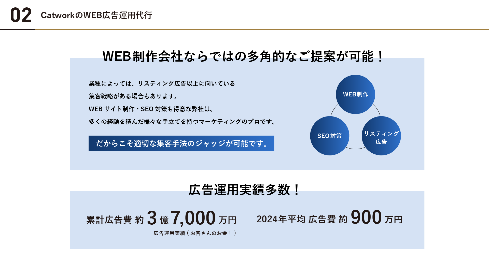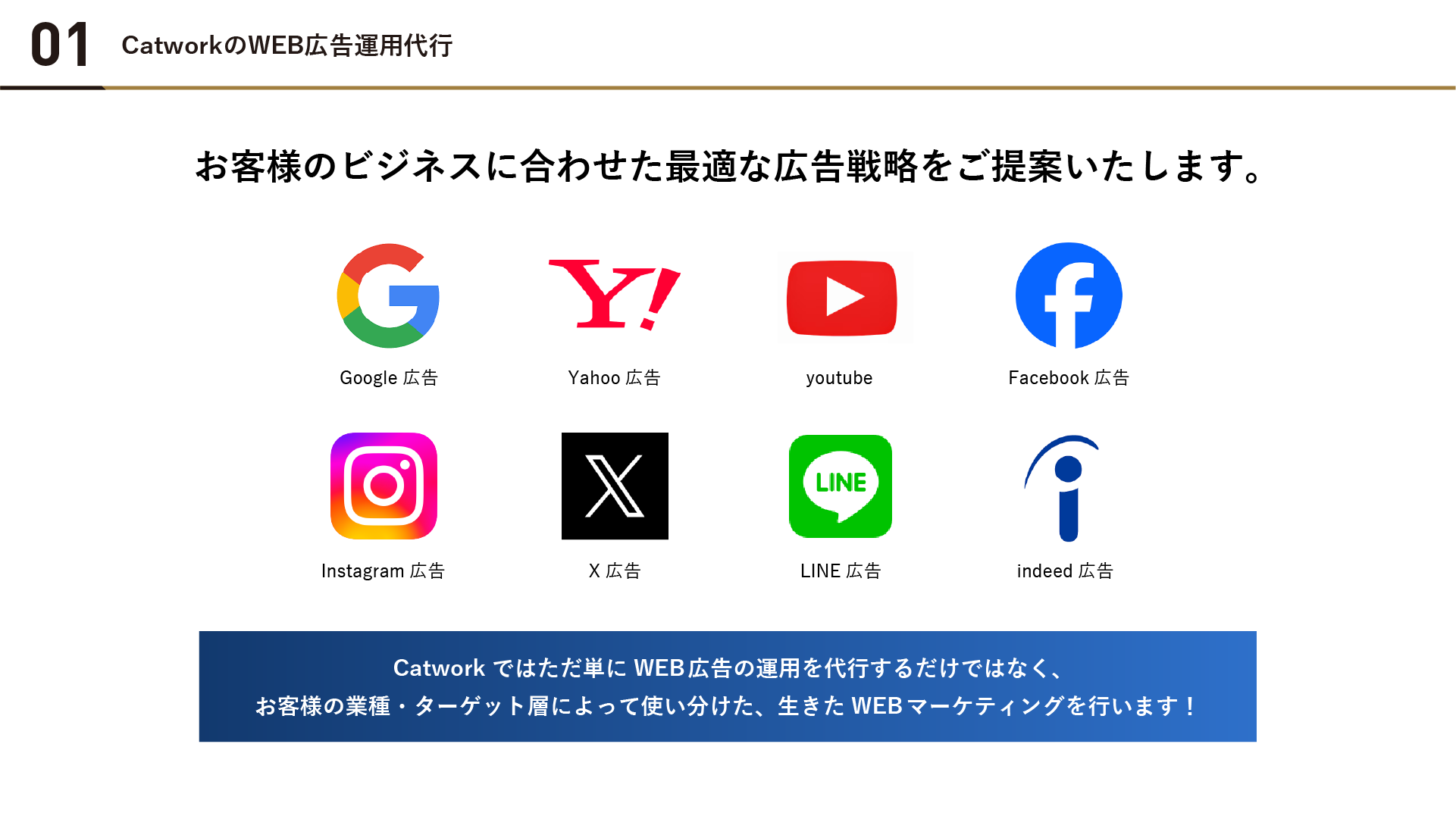 名古屋を拠点に、CatworkPPC が展開するリスティング広告運用代行サービス。月額5万円〜のミニマム予算対応で、Google/Yahoo/SNS/YouTube 等の広告を“成果重視”で最適運用し、SEO やWEB制作と連携した集客力強化を実現します。